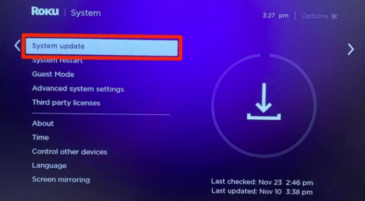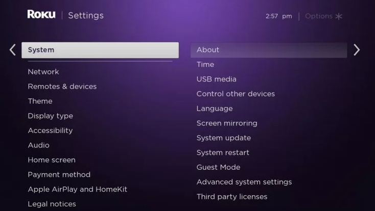 Dependiendo de tu modelo de Roku y del número de versión de Roku, encontrarás la opción Reinicio del sistema en Configuración > Sistema > Encendido o en Configuración > Reinicio del sistema.