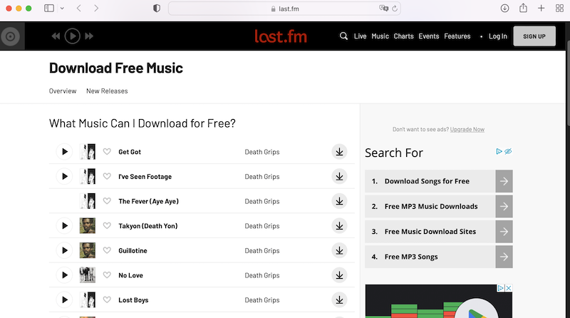 Last.fm es el mayor servicio de música en línea del mundo. Escucha online, descubre más sobre tus artistas favoritos y obtén recomendaciones musicales, sólo en Last.fm. También tiene una página Download Free Music que permite descargar canciones en MP3 gratis incluso sin tener una cuenta. Las canciones se descargan en MP3 a 128 kbps con información sobre el artista y el álbum. Sin embargo, la carátula del álbum no se guarda.