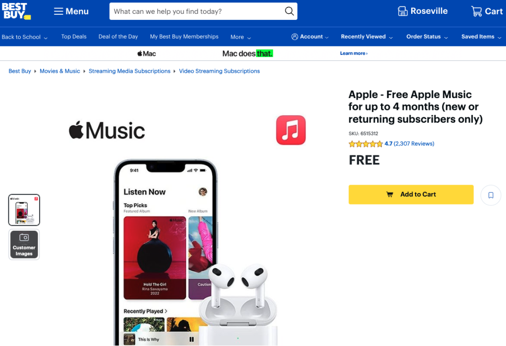También puedes conseguir Apple Music gratis en Best Buy. Normalmente, los nuevos suscriptores reciben una generosa oferta de cuatro meses gratis de Apple Music, mientras que a los clientes habituales se les ofrecen tres meses. Sin embargo, si se intenta canjear esta oferta varias veces con el mismo ID de Apple, puede producirse un error. Pero aún puedes aprovechar esta oferta comprándola por separado para diferentes ID de Apple.
