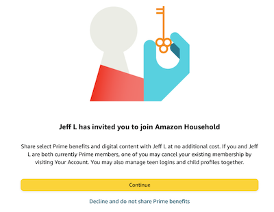 10. La persona a la que invites recibirá un correo electrónico de confirmación. La persona a la que invites recibirá un correo electrónico de Amazon con el enlace de invitación. Haz clic en Continuar.