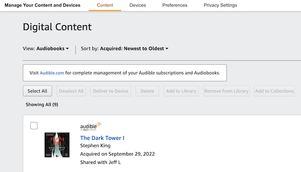 1. ¿Cómo compartir audiolibros en el hogar de Amazon? Ve a amazon.com en tu navegador e inicia sesión, haz clic en tu nombre en la esquina superior derecha. Desplázate hacia abajo y elige Gestionar contenidos y dispositivos.