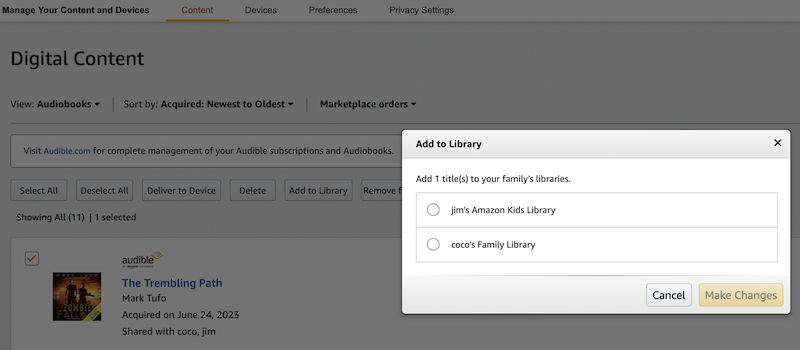 3. Selecciona los audiolibros que quieras compartir y haz clic en Añadir a la biblioteca.