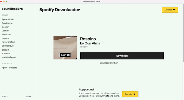 https://www.soundloaders.com/spotify-downloader/ es otro descargador online gratuito de Spotify para convertir Spotify a MP3. A diferencia de spotifydown.com, sólo puede detectar el enlace de la canción de Spotify, sin incluir el enlace del álbum o la lista de reproducción de Spotify. Las canciones también se descargan en 320kbps, nombradas con el nombre del artista y el título de la canción, como DaBaby – SHAKE SUMN.mp3.