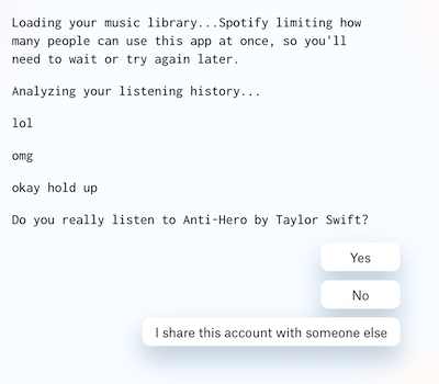 Qué tan mala es tu música en streaming es una Inteligencia Artificial entrenada para evaluar el gusto musical. Se trata de un proyecto satírico y no utiliza inteligencia artificial real, sino una falsa IA pretenciosa amante de la música. El código crea una mezcla personalizada de chistes a partir de su base de datos combinada con los datos de artistas, álbumes, géneros y canciones de Spotify. Para empezar, inicia sesión en tu cuenta de Spotify.