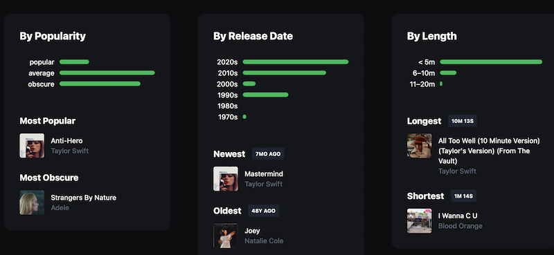 volt.fm es otro sitio web de estadísticas de Spotify que proporciona más detalles, como los géneros más escuchados, los artistas más escuchados, las canciones más escuchadas, los álbumes más escuchados, análisis de las últimas 4 semanas, 6 meses y todos los tiempos respectivamente. También clasifica las canciones por popularidad, fecha de lanzamiento y duración.