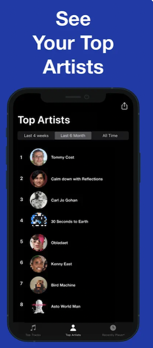 Spotistats para Spotify analiza tu biblioteca de música y proporciona estadísticas detalladas sobre tus hábitos de escucha. Descubre tus artistas, canciones, álbumes, listas de reproducción y géneros favoritos. Con un solo toque, puedes abrir cualquier canción, artista o álbum directamente en la aplicación de Spotify. Explora las canciones añadidas recientemente, la música reproducida recientemente y mucho más para descubrir nueva música en Spotistats para Spotify.