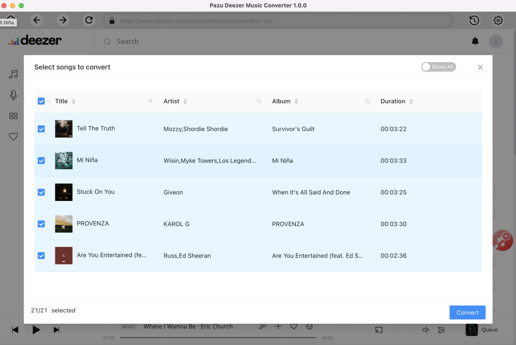Por defecto, se comprobarán todas las canciones de la lista de reproducción/álbum. Si hay canciones que no quieres convertir, desmarca la casilla. A continuación, haz clic en el botón Convertir para empezar a descargar las canciones en el formato que elijas.