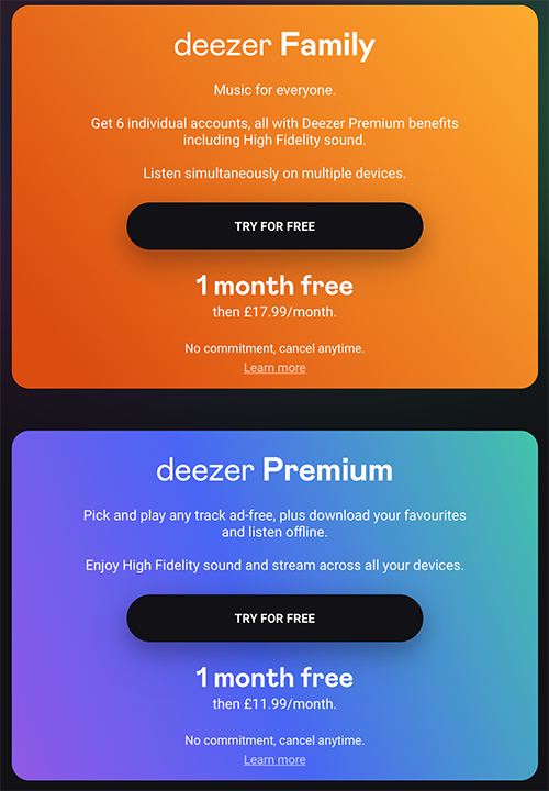 Deezer Premium en Reino Unido: 1 mes gratis luego £11.99/mes.