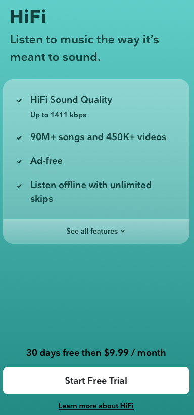 Tidal HiFi: 30 días gratis y luego $9.99 al mes. Calidad de sonido HiFi. Hasta 1411 kbps. Te permite transmitir audio utilizando el formato sin pérdidas FLAC, creando una experiencia de transmisión de música nítida y robusta.