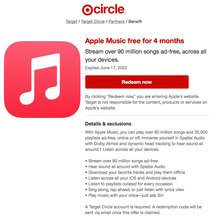 El año pasado, Target lanzó una promoción por la que Los usuarios de Target Circle obtendrían Apple Music Gratis durante 4 meses. Esta oferta ha caducado el 17/06/2022. A continuación encontrarás los detalles: