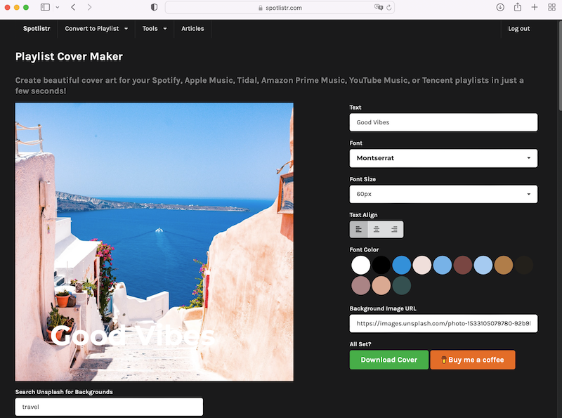 ¡El creador de carátulas para listas de reproducción Spotlistr te permite crear bonitas carátulas para tus listas de reproducción de Spotify, Apple Music, Tidal, Amazon Prime Music, YouTube Music o Tencent en cuestión de segundos!
