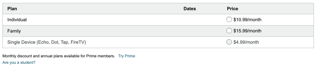 Como puedes ver en la tabla de precios anterior, Amazon Music Unlimited no se incluye de forma gratuita con una suscripción a Amazon Prime. Los miembros Prime también tienen que pagar por Amazon Music Unlimited, pero a un precio con descuento.