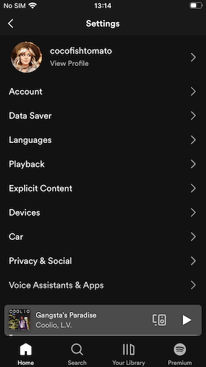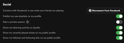 8. Para desconectar Spotify de Facebook, haz clic en el icono de tu perfil y elige Configuración. Desplázate hasta Social y haz clic en Desconectar de Facebook.