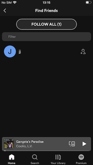 6. Si ya has conectado tu cuenta de Facebook a Spotify, deberías ver una lista de amigos que también utilizan Spotify. Puedes pulsar el botón añadir amigo junto a una persona en concreto o pulsar SEGUIR A TODOS para seguir a todas las personas de la lista.