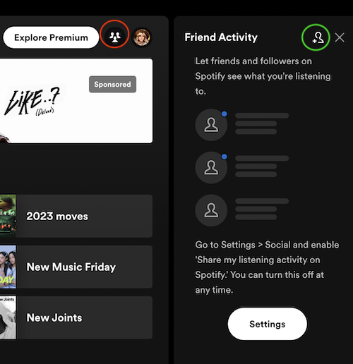 1. Abre la aplicación Spotify y haz clic en Actividad de amigos. Abre la aplicación Spotify y haz clic en el icono Actividad de amigos (círculo rojo) y, a continuación, en el icono Añadir amigos (círculo verde).