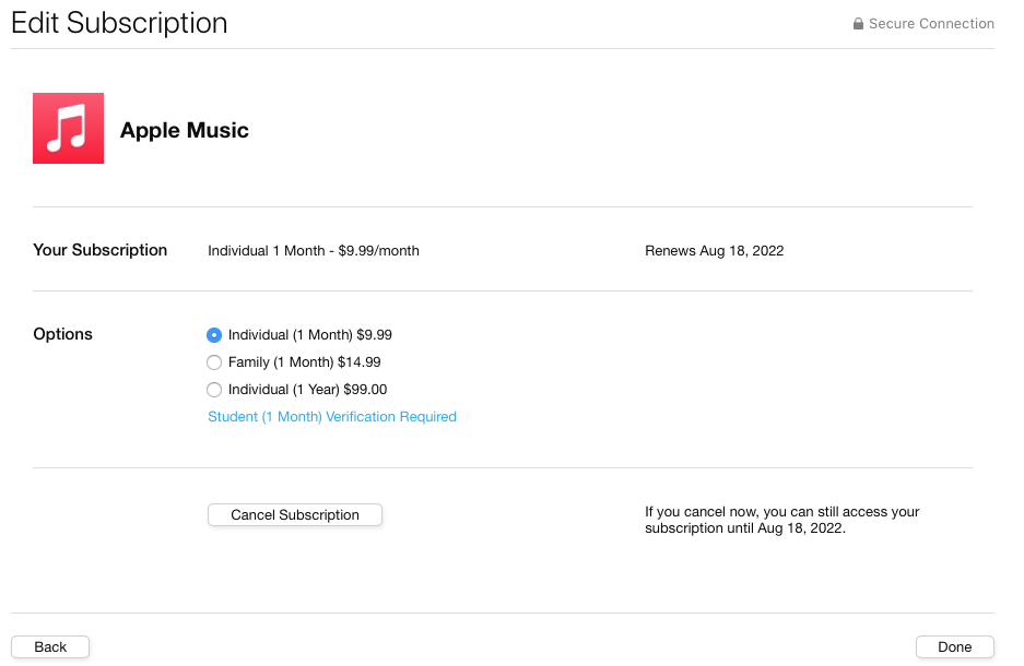 Si no encuentras Cancelar suscripción, comprueba si no te has suscrito a Apple Music directamente sino que te has unido a una suscripción familiar de Apple Music. Si ese es el caso, solo el organizador puede cancelar la suscripción a Apple Music.