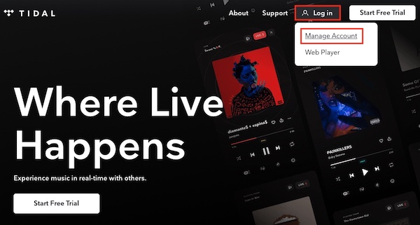 Paso 1. Ve a tidal.com e Inicia sesión en tu cuenta. Elige Administrar cuenta cuando inicies sesión.