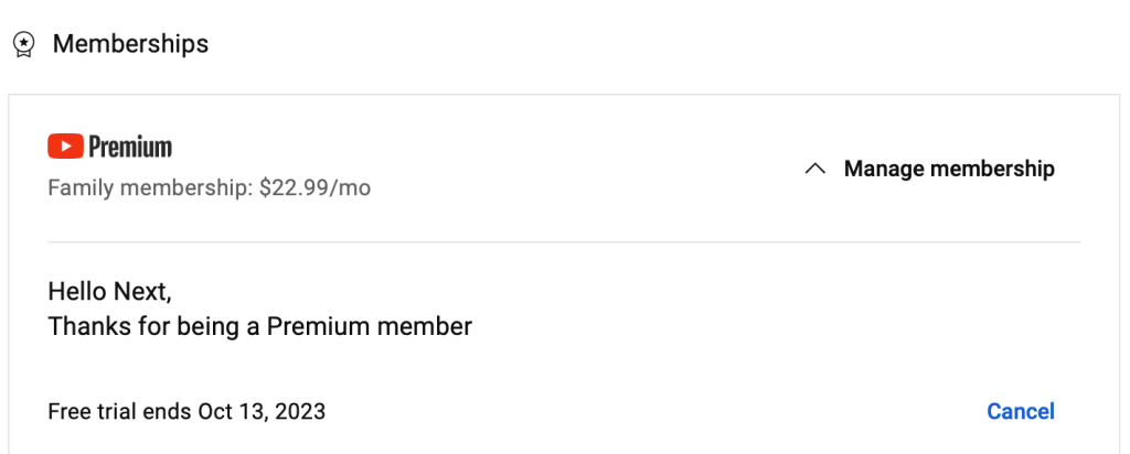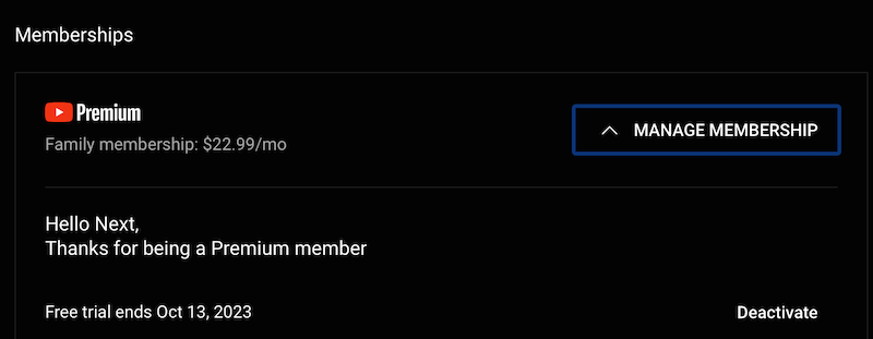 Si te has suscrito a la prueba gratuita de YouTube Music Premium, no a la prueba gratuita de YouTube Premium, ve a https://music.youtube.com/paid_memberships, y haz clic en Desactivar.
