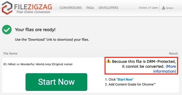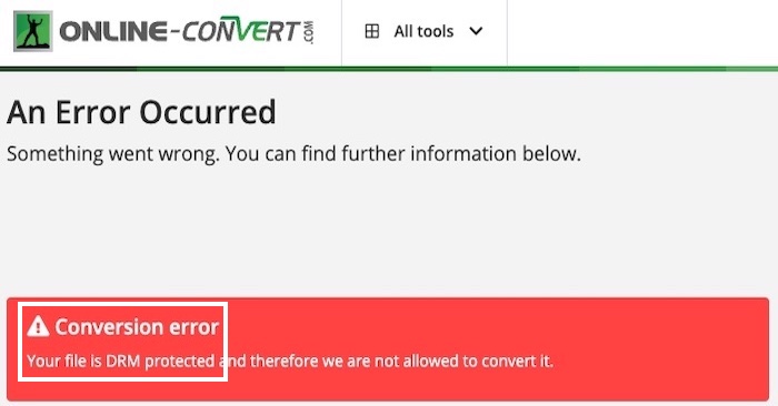 Puede utilizar conversores en línea para convertir archivos de música no protegidos si el archivo está en su ordenador. Sin embargo, al intentar convertir archivos M4P protegidos por DRM con conversores online gratuitos como FileZigZag y Online-converter, se encontrará con un mensaje de error como “Su archivo está protegido por DRM y no se puede convertir.” Por lo tanto, los convertidores en línea no se pueden utilizar para transferir archivos M4P protegidos por DRM a MP3 debido a la protección DRM.