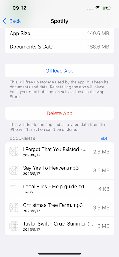 Para eliminar archivos locales de tu iPhone, ve a Ajustes – General – Almacenamiento del iPhone – Spotify. Toca EDITAR y borra las canciones que no quieras.