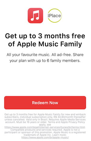En Brasil, los suscriptores nuevos y antiguos pueden disfrutar de hasta 3 meses de suscripción familiar a Apple Music gratis. Tras el periodo de prueba, la suscripción tendrá un precio de 34,90 € al mes. La suscripción se renovará automáticamente hasta que se cancele, y se requiere un ID de Apple para aprovechar esta oferta. Tenga en cuenta que esta oferta sólo está disponible para mayores de 16 años.