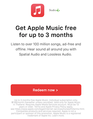Consigue hasta 3 meses de Apple Music gratis con una suscripción individual. Tras el periodo de prueba, la suscripción costará ฿139 al mes a menos que se cancele. Esta oferta solo es válida para Apple Music en Tailandia y requiere una cuenta de Apple Media Services. Ten en cuenta que debes tener 13 años o más para beneficiarte de esta oferta.