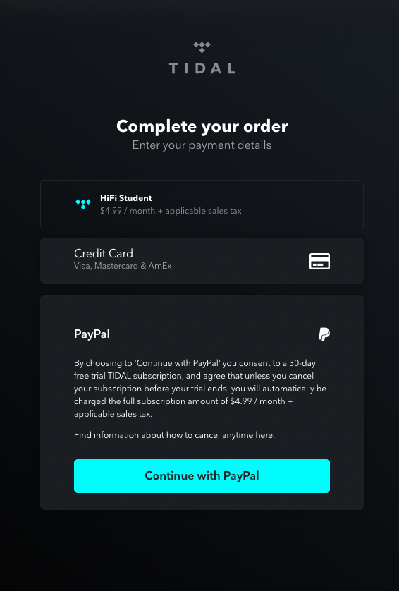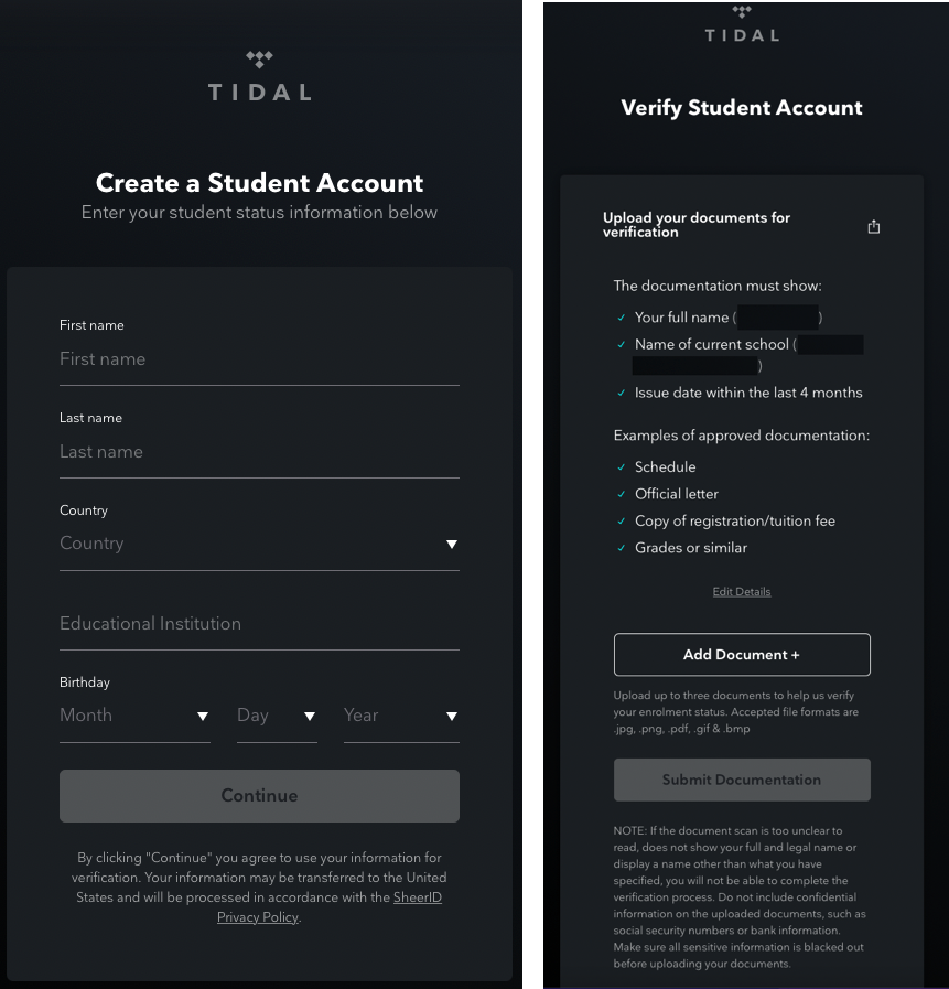 Los usuarios que soliciten un descuento Tidal para estudiantes necesitan seguir dos pasos: Crear una cuenta de Tidal y verificar la cuenta de estudiante a través de SheerID.