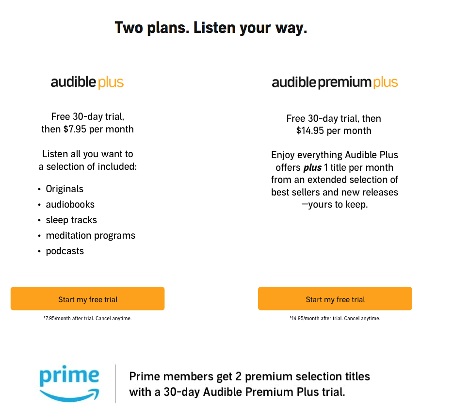 Audible ofrece 2 planes: Audible Plus y Audible Premium Plus. Ambos ofrecen 30 días de prueba gratis. Si eres nuevo en el servicio, la opción obvia es registrarte para la prueba gratuita de 30 días. Una vez finalizado el periodo de prueba de 30 días, se te cobrarán 7,95 $/ 14,95 $ al mes, o simplemente puedes cancelar la prueba antes de la fecha de finalización. A pesar de la cancelación, podrás seguir accediendo a todos los libros que hayas descargado durante el periodo de prueba. La mayoría de los audiolibros cuestan más de 14,95 $, así que sigues ahorrando dinero. Si tienes un Amazon Echo, puedes incluso ampliar tu periodo de prueba de 30 días a 60 días. Consulta la detalles aquí.