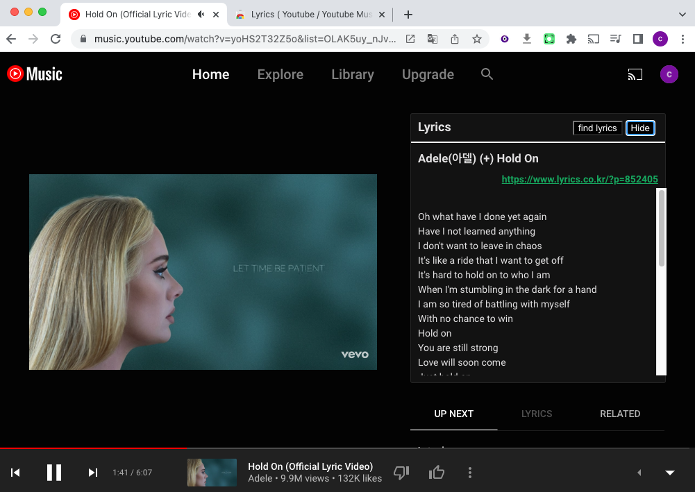 2. Abre https://music.youtube.com/, reproduce una canción y verás a continuación la función Lyrics.