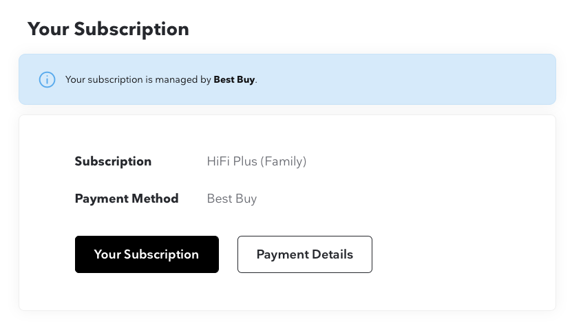 Si quieres cancelar la suscripción a Tidal antes de que caduque la oferta de 3 meses, como tu suscripción está gestionada por Best Buy, tienes que visitar la cuenta de BestBuy.com para administrar tu suscripción.