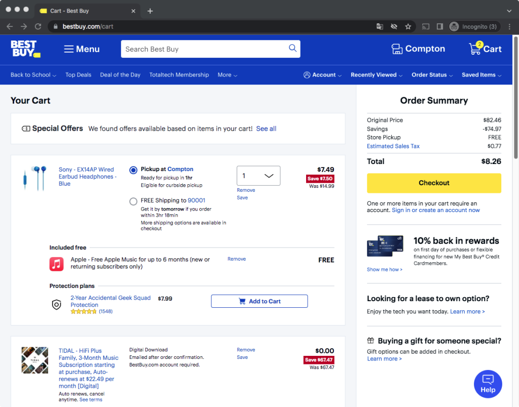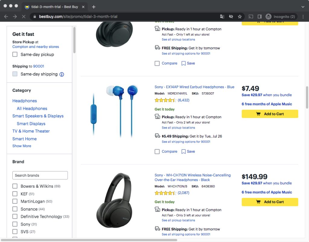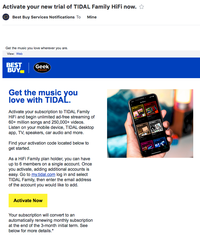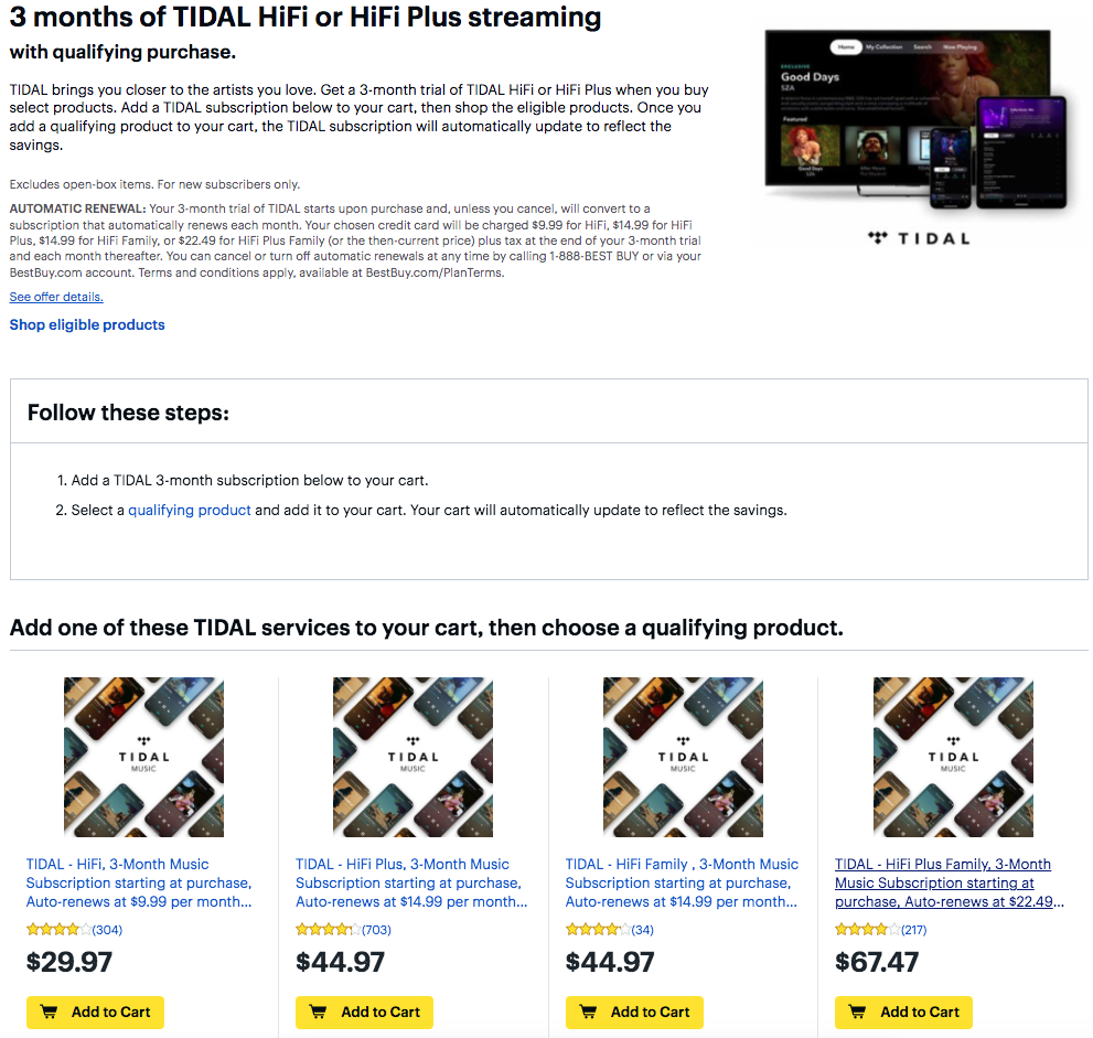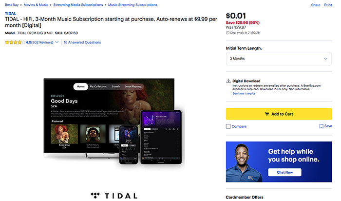 Best Buy ofrece Suscripción de 3 meses a TIDAL HiFi por sólo 1 $. Se renueva automáticamente a 9,99 $ al mes. Ábrelo en tu navegador, haz clic en Añadir al carrito. Ve al carrito y haz el pago. La suscripción comienza en el momento de la compra y se renueva automáticamente de forma mensual después de 3 meses. Se cargarán en la tarjeta elegida 9,99 $ al mes en la fecha de renovación, a menos que cancele o cancele la renovación automática antes de esa fecha llamando al 1-888-BEST BUY (1-888-237-8289) o gestionando su suscripción en la página Página de planes y suscripciones a través de tu cuenta de BestBuy.com.