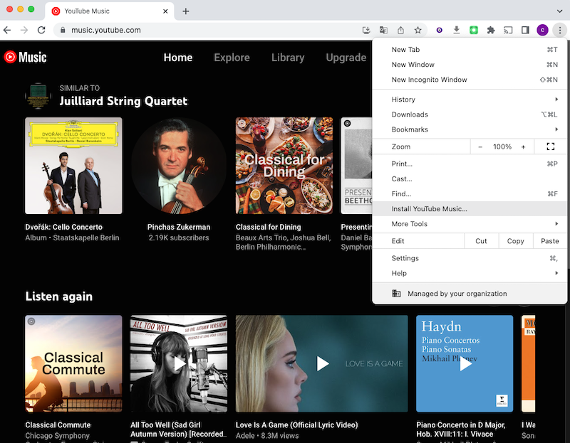 1. Ir a la página oficial de la PWA Ve a la página oficial YouTube Music website en tu Google Chrome, Microsoft Edge, o cualquier navegador que soporte la instalación de PWA.
