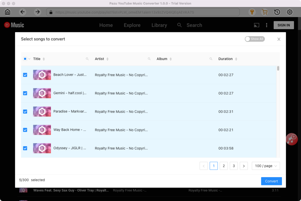 Como alternativa, puedes descargar cualquier canción de YouTube Music a MP3 y luego reproducirla con tu aplicación de reproducción de música de escritorio, como Apple Music, iTunes, Windows Media Player, etc. Pazu YouTube Music Converter es un descargador profesional de YouTube Music con reproductor web de YouTube Music incorporado. Usted puede navegar fácilmente o buscar las canciones, álbum y lista de reproducción que desea descargar y luego descargarlos a MP3, M4A, AAC, FLAC, WAV y AIFF dentro de un solo clic.