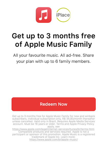 Los suscriptores nuevos y antiguos de Apple Music en Brasil pueden obtener hasta 3 meses gratis para el plan familiar de Apple Music, R$ 34,90/mes a partir de entonces a menos que lo cancelen. Haz clic en aquí para conocer los detalles. Si no vives en Brasil, es difícil obtener esta prueba gratuita de 3 meses, ya que requiere CPF/CNPJ (Un CPF es un número de identificación de contribuyente individual dado a las personas que viven en Brasil, tanto brasileños nativos como extranjeros residentes, que pagan impuestos).