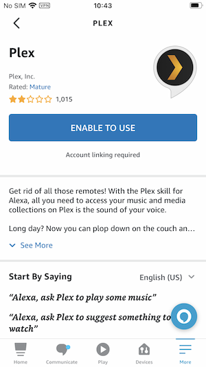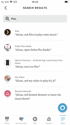 1. Busca “Plex” en la lista de comandos de voz. Busca “Plex” en la sección Habilidades de la aplicación móvil Alexa.