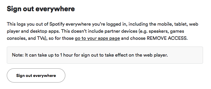 Se cierra la sesión de Spotify en todos los sitios en los que has iniciado sesión, incluidas las aplicaciones para móvil, tableta, reproductor web y escritorio. Esto no incluye los dispositivos asociados (por ejemplo, altavoces, consolas de juegos y televisores), así que para esos ve a tu página de aplicaciones y elige ELIMINAR ACCESO.