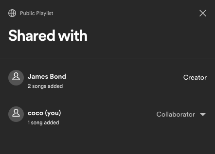 Todas las canciones de una lista de reproducción colaborativa son añadidas por el Creador y el Colaborador. Spotify no añade canciones. Sólo el creador puede invitar colaboradores.
