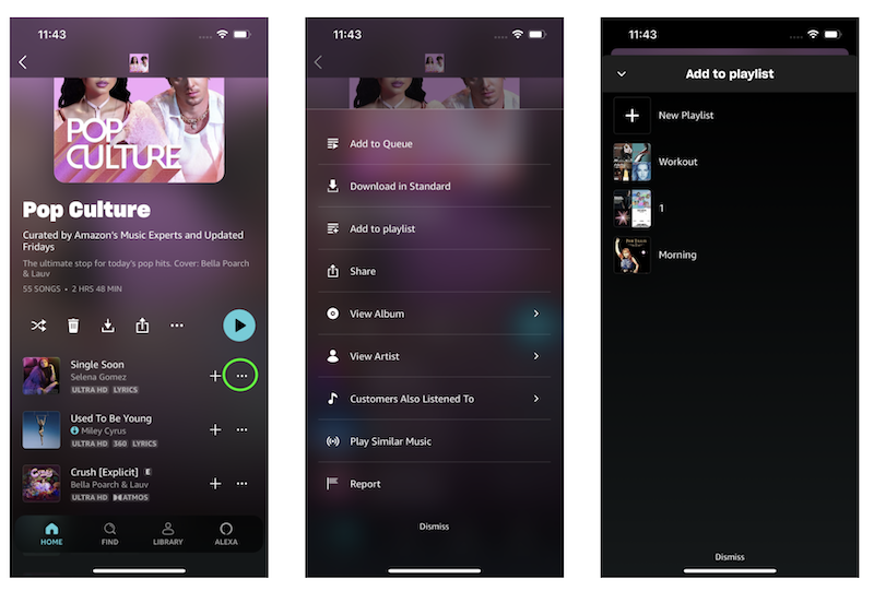 4. Ahora busca las canciones que quieras añadir a la lista de reproducción y haz clic en el icono de los tres puntos y elige Añadir a lista de reproducción.