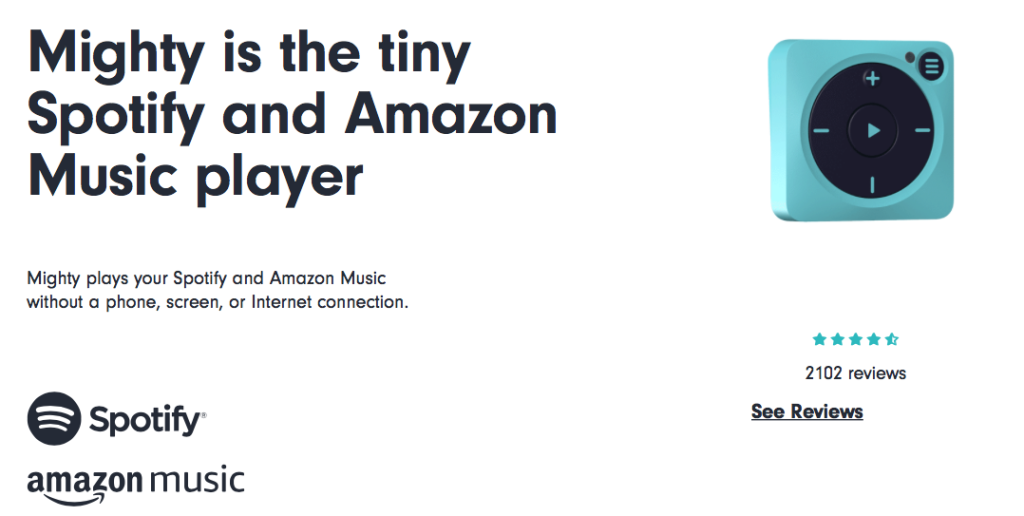 Lanzado en 2017, Mighty era conocido como iPod Shuffle para Spotify, que permite a los usuarios llevar las canciones de Spotify a cualquier parte sin teléfono. Luego, en diciembre, Mighty añadió soporte para Amazon Music.