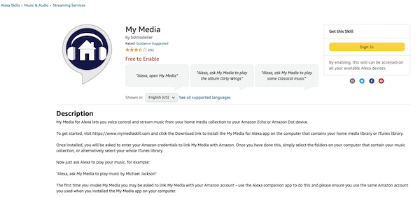 My Media para Alexa te permite controlar por voz y transmitir música desde tu colección multimedia doméstica a tu dispositivo Amazon Echo o Amazon Dot. Para empezar, visite https://www.mymediaskill.com y haga clic en el enlace Descargar para instalar la aplicación My Media para Alexa en el ordenador que contenga su biblioteca multimedia doméstica o su biblioteca de iTunes.