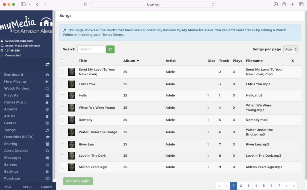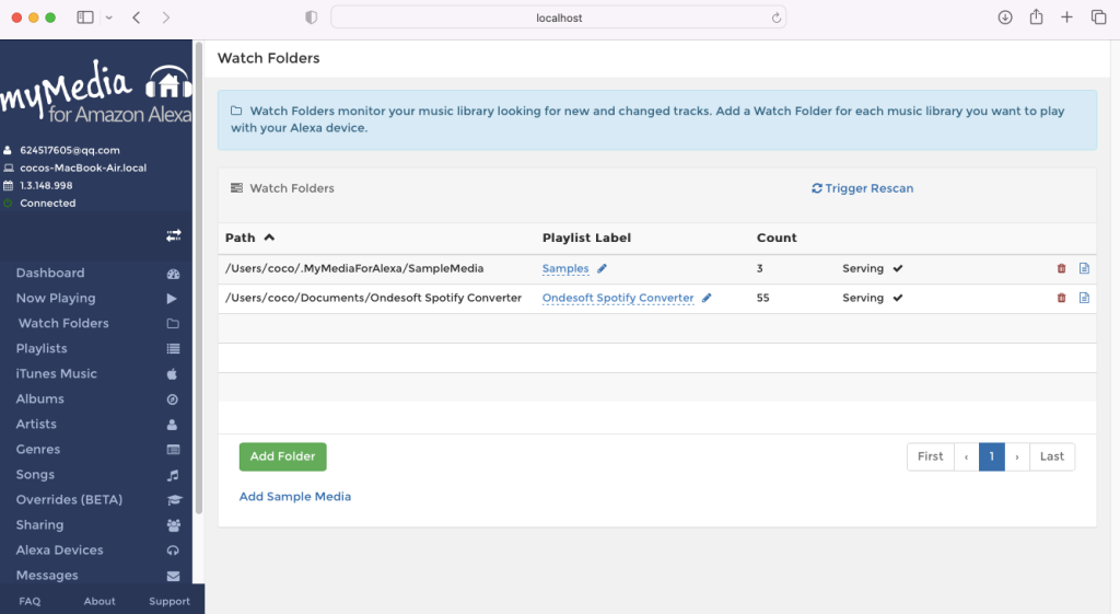Inicia My Media para Alexa en tu ordenador e inicia sesión en tu cuenta de Amazon. Haz clic en Watch Folders – Add Folder y selecciona la carpeta de salida anterior para que My Media for Alexa escanee todas las canciones mp3 descargadas de Apple Music. My Media para Alexa indexará automáticamente tu música y la pondrá a disposición de Alexa.