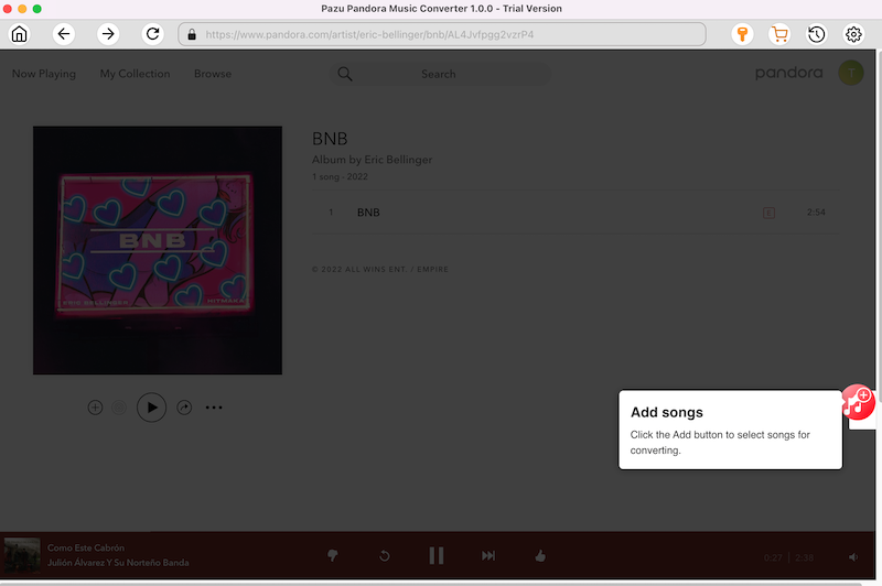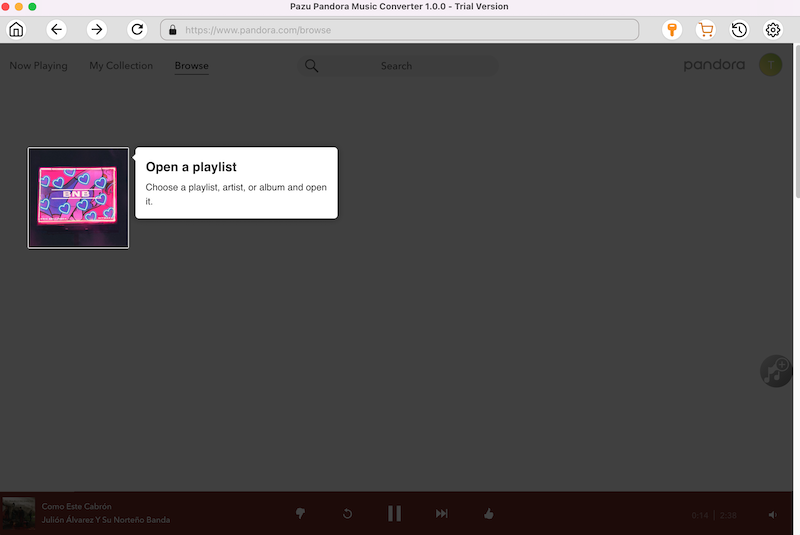 Sólo tiene que iniciar sesión en su cuenta de Pandora en el reproductor web incorporado de Pandora y navegar por su colección o biblioteca de Pandora para encontrar la canción, álbum, podcast o lista de reproducción que desea descargar. Además, puedes escribir artista, título de la canción, podcasts y más en el cuadro de búsqueda, selecciona el resultado que deseas.