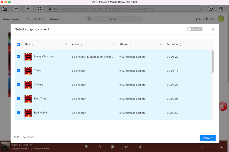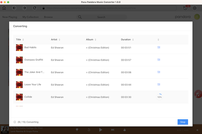 Después de seleccionar las canciones, haz clic en el botón “Convertir” y podrás descargar canciones de Pandora sin Premium. Tomará unos minutos para convertir las canciones.