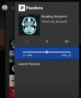 Para controlar la música, pulsa el botón Xbox de tu mando para abrir la guía y, a continuación, selecciona Pandora, aquí podrás saltar o pausar o elegir más opciones.