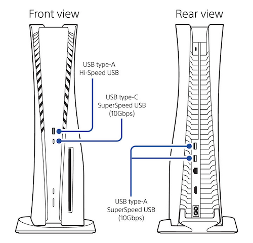 Las consolas PS5 tienen cuatro puertos USB que admiten diferentes velocidades de conexión y son compatibles con distintos dispositivos: dos puertos en la parte frontal y dos puertos en la parte trasera.