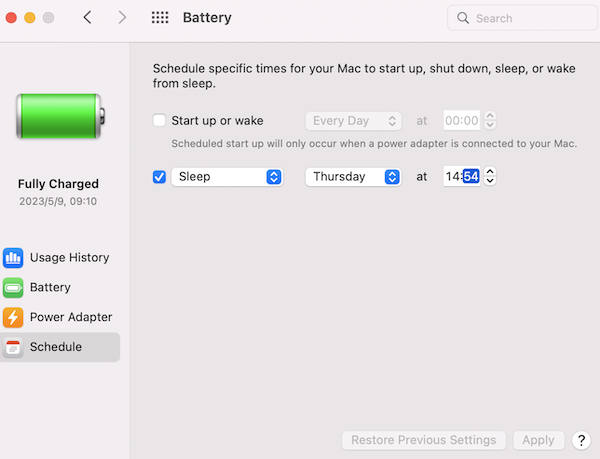 2. Haz clic en Programar. Establezca la hora preferida para que su Mac se apague o entre en reposo y haga clic en Aplicar para confirmar.