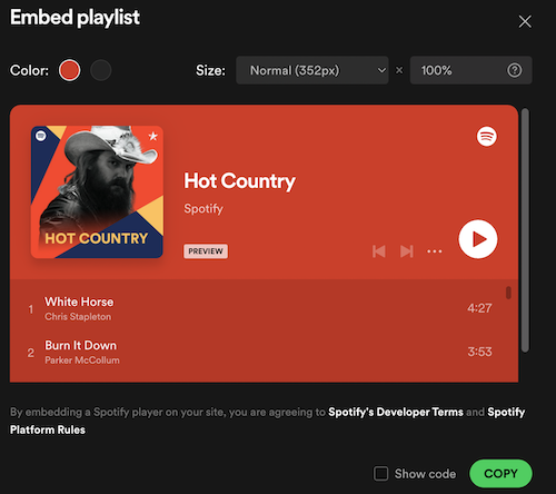 También puedes elegir Embed playlist para incrustar una lista de reproducción en tu página web. Después de configurar el color de fondo y el tamaño, haga clic en COPIAR. A continuación, pegue el código de inserción en su blog o página web.