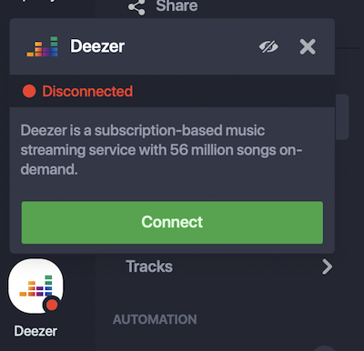 2. Elige el icono de Deezer en la parte izquierda y haz clic en Conectar. Accede a tu cuenta Deezer en la ventana emergente.