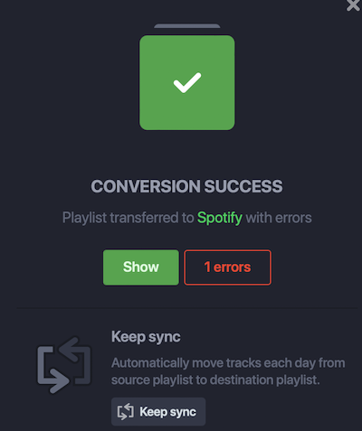 5.- Después de la conversión, comprueba la lista de reproducción. Después de la conversión, comprueba la lista de reproducción en Spotify. Debido a diferencias en los catálogos de música o en los acuerdos de licencia, es posible que algunas canciones no estén disponibles en la plataforma de destino. Si hay canciones no disponibles en Spotify, aparecerán errores, ya que las canciones no se pueden emparejar.