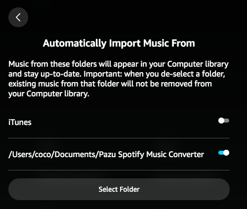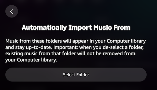 4. Haz clic en Seleccionar carpeta y elige la música que quieras añadir a Amazon Music.